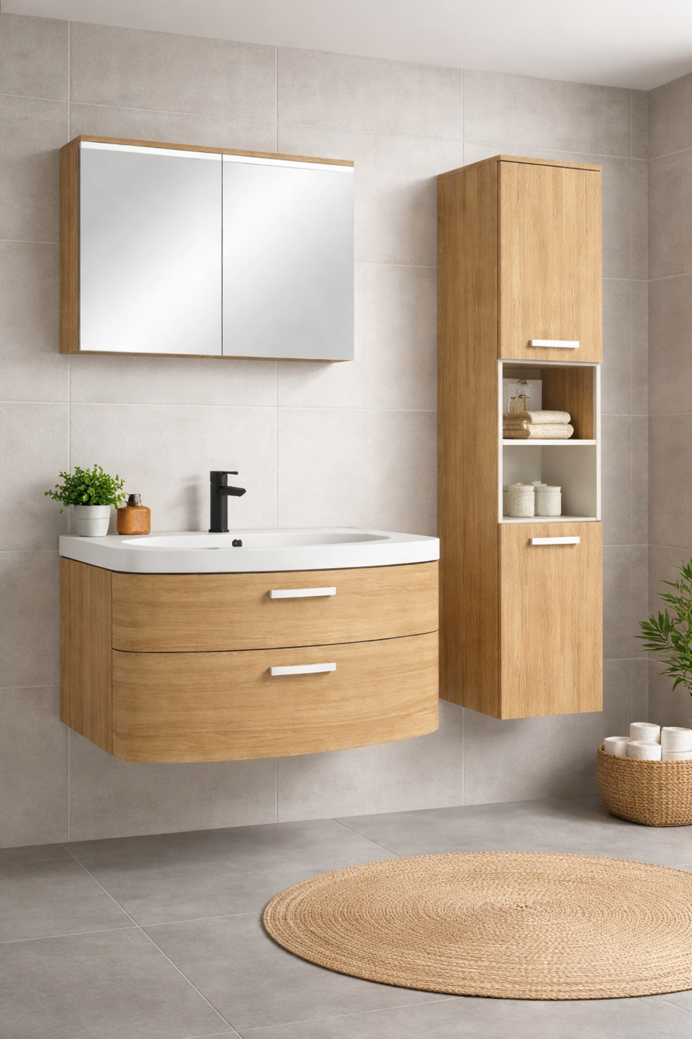 Dieses Set aus modernen, minimalistischen Badezimmermöbeln besticht durch sein klares und natürliches Design, das Funktionalität und Ästhetik vereint und sich somit ideal für moderne Familienbäder eignet.